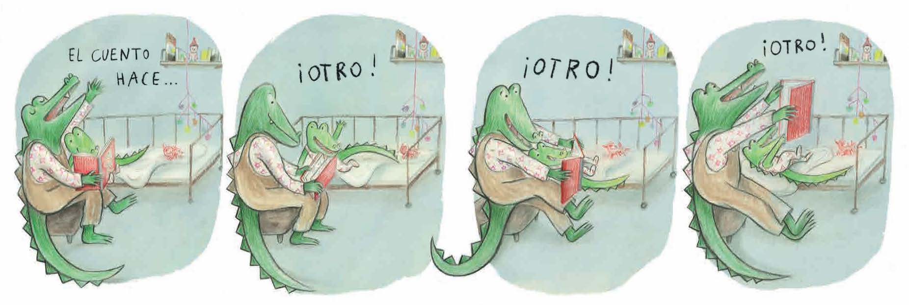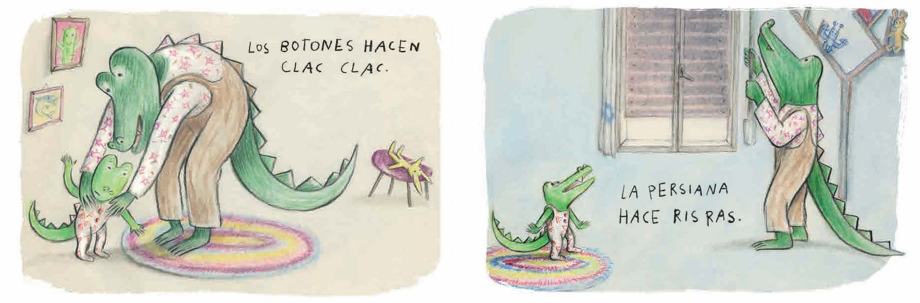 Los vasos hacen CHIN CHIN, el avión hace FIUUU, el cepillo de dientes hace FRUS FRUS FRUS, la nana dice ESTRELLITA, DÓNDE ESTÁS… ¿Y el pequeño Cocodrilo? BUAAA, BUAAA…